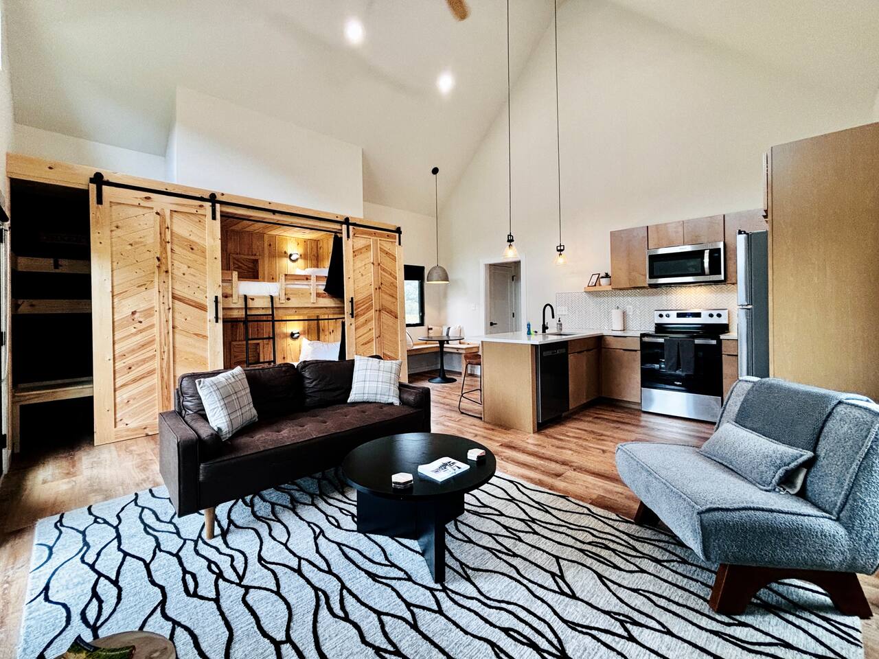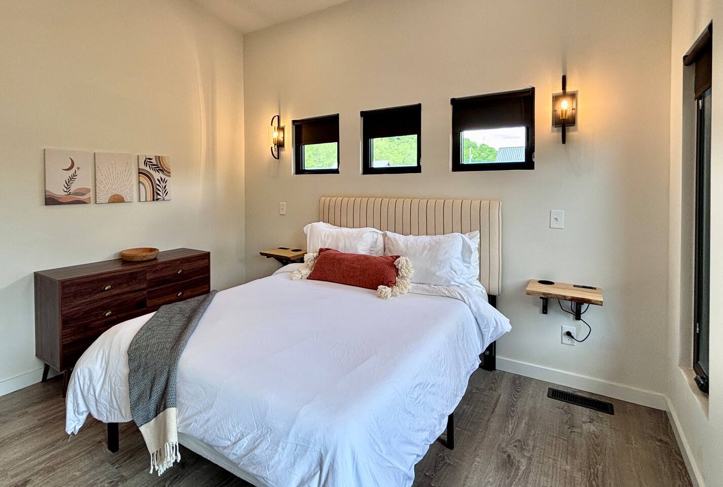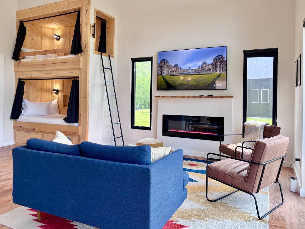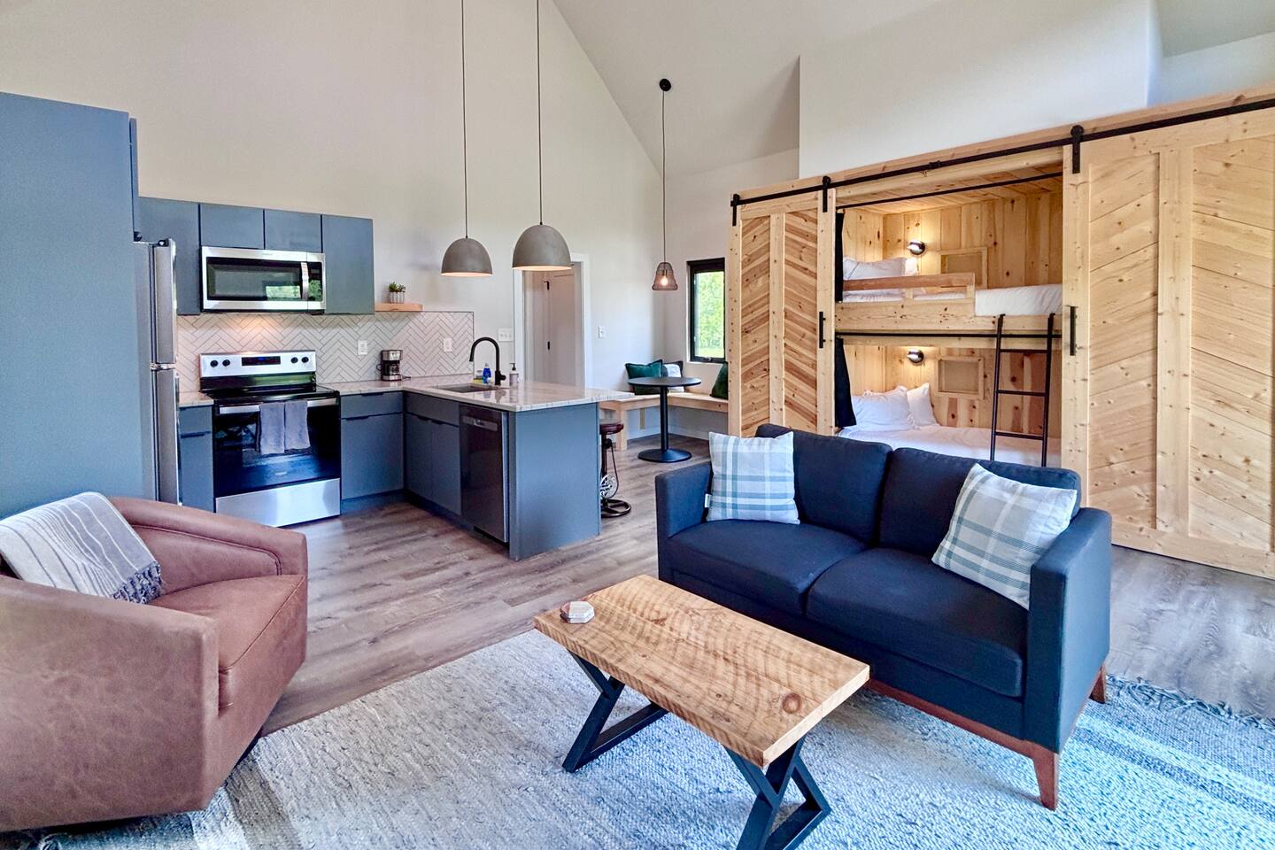 Three Suns Cabins Full Rental sleep a total of 29 guests and offers 8 individual cozy retreats with modern comforts and stunning views. Here's a detailed look at each cabin: Moonrise Meadow: Sleeps 4 guests, featuring a queen bed within a private bedroom and XL twin bunk beds in the main living area. Trail Tamer: Sleeps 2 guests, featuring a queen bed within the private bedroom. Wildflower Walk: Sleeps 4 guests, featuring a queen bed within the bedroom and XL twin bunk beds in the main living area. Perfect Perch: Sleeps 5 guests, featuring a queen bed in the bedroom and a lofted space with 3 XL twin beds (two standalone twin beds and one additional trundle/pullout twin bed) River Rascal: Sleeps 4 guests, featuring a queen bed within a private bedroom and XL twin bunk beds in the main living area. River’s Edge: Sleeps 4 guests, featuring a queen bed within the bedroom and XL twin bunk beds in the main living area. Knob Hill: Sleeps 2 guests, featuring a queen bed within the private bedroom. Hiker’s Haven: Sleeps 4 guests, featuring a queen bed within the private bedroom and XL twin bunk beds in the main living area. Each cabin includes: A comfortable bedroom with a queen bed, TV and an electric fireplace. A living room with an electric fireplace, flat-screen smart TV, and comfortable seating. A fully equipped kitchen with modern appliances. An enclosed private back deck with a hot tub overlooking the mountains. A private fire pit for evening gatherings. Outdoor charcoal grill. WIFI provided by Starlink Please note: If you are planning to host an event at Three Suns Cabins, please contact the host directly for details about small events and gatherings, as additional fees may apply.