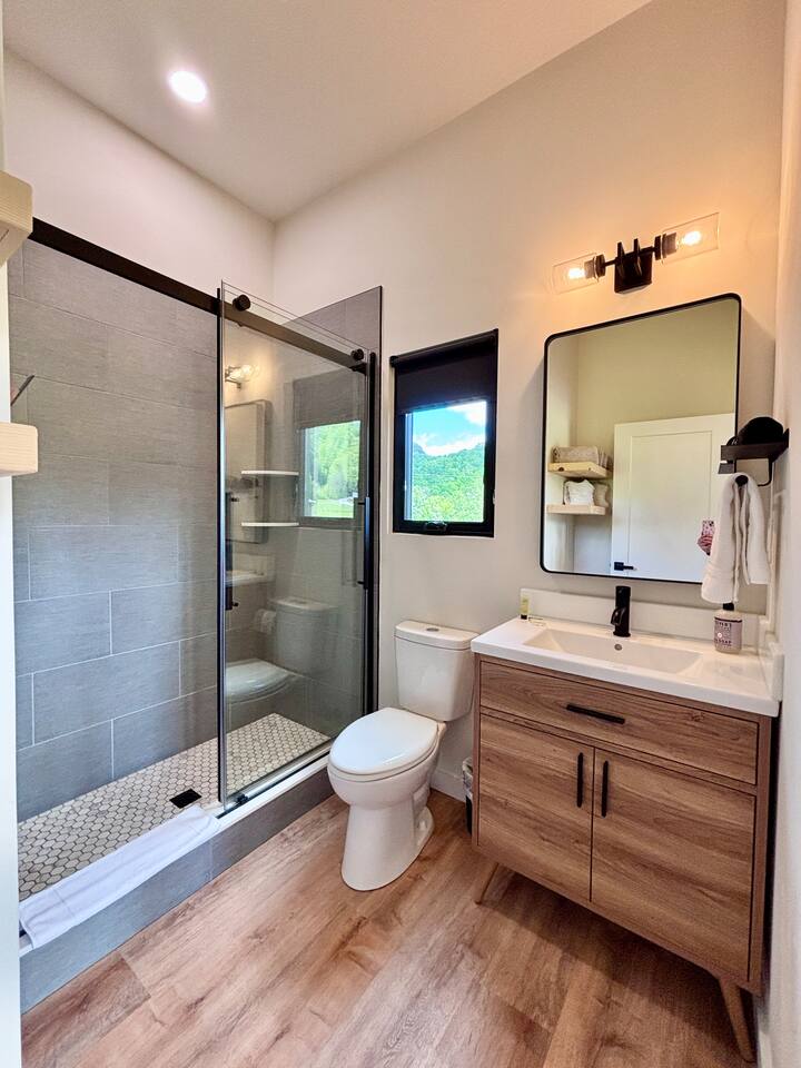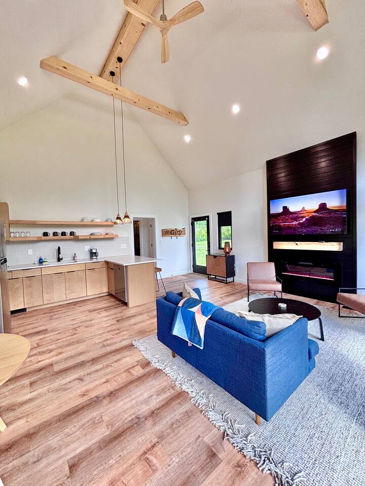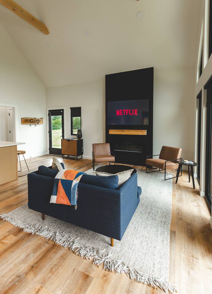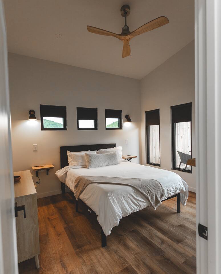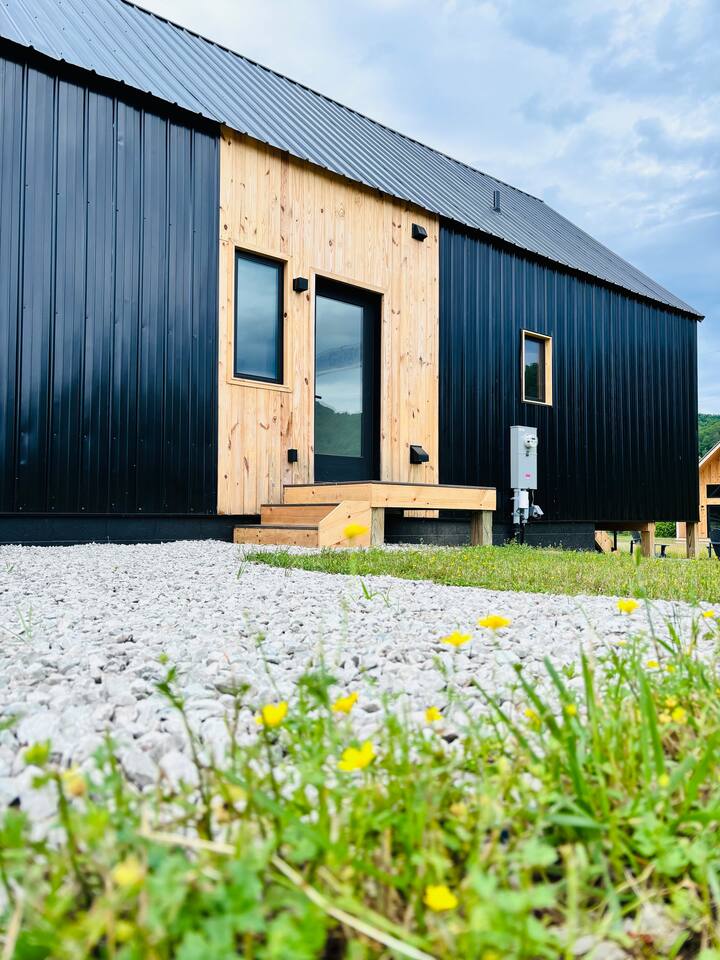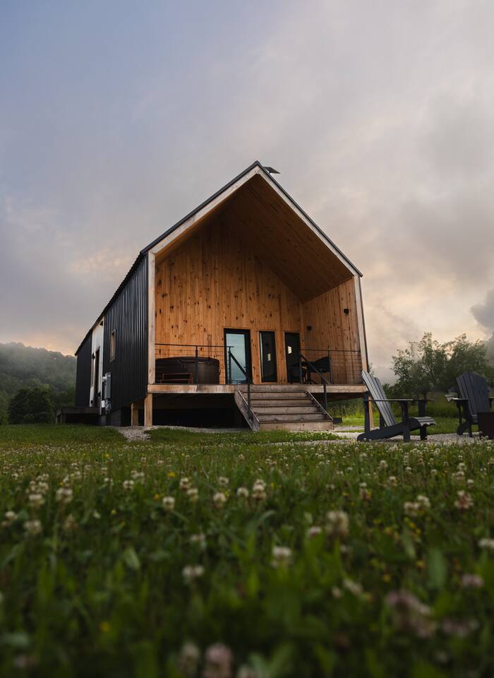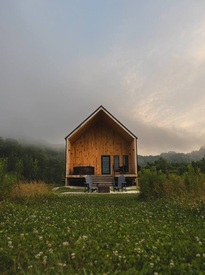 Trail Tamer greets you with an inviting open-plan layout that includes a fully stocked kitchen, perfect for creating culinary delights. The living area, with its impressive floor-to-ceiling windows, floods the space with natural light. After a day of adventure in the Gorge, relax by the cozy fireplace that adds warmth and ambiance. The bedroom features a queen bed for a restful night's sleep. Wake up to the sounds of nature and sip your morning coffee on the private deck, where you can enjoy the stunning sunrise over the mountains. Outside, a private fire pit awaits, ideal for starlit evenings, roasting marshmallows, and sharing stories. For ultimate relaxation, soak in the private hot tub, surrounded by the serene landscape. Trail Tamer is part of the unique collection of 8 modern cabins at Three Suns Cabins, which can be booked together for larger gatherings or special events. Whether you're seeking a romantic escape or a peaceful retreat, our Nordic-inspired cabin promises a memorable stay filled with comfort and tranquility. Reserve your stay today and experience the enchantment of Red River Gorge.