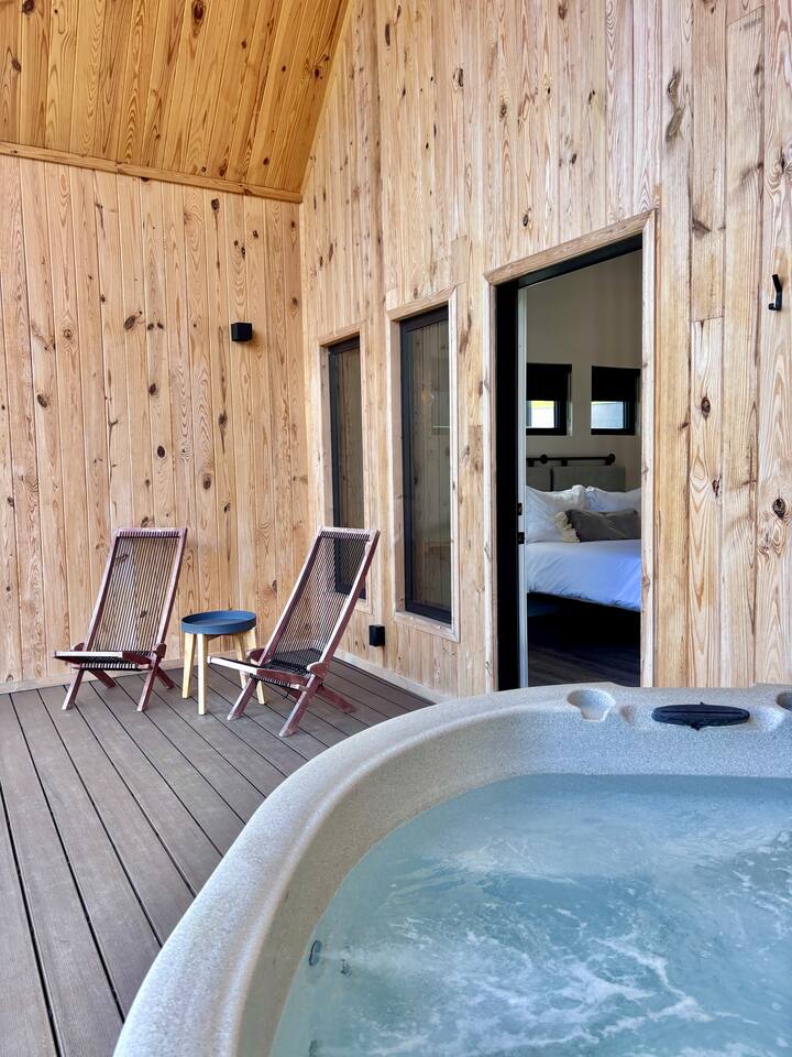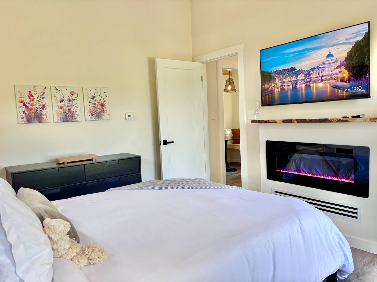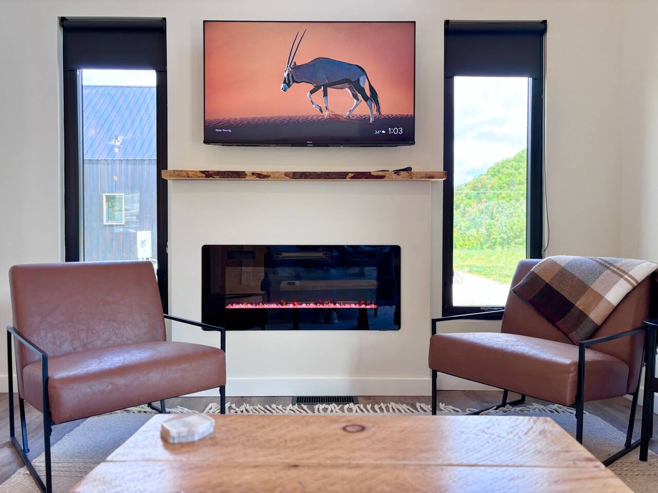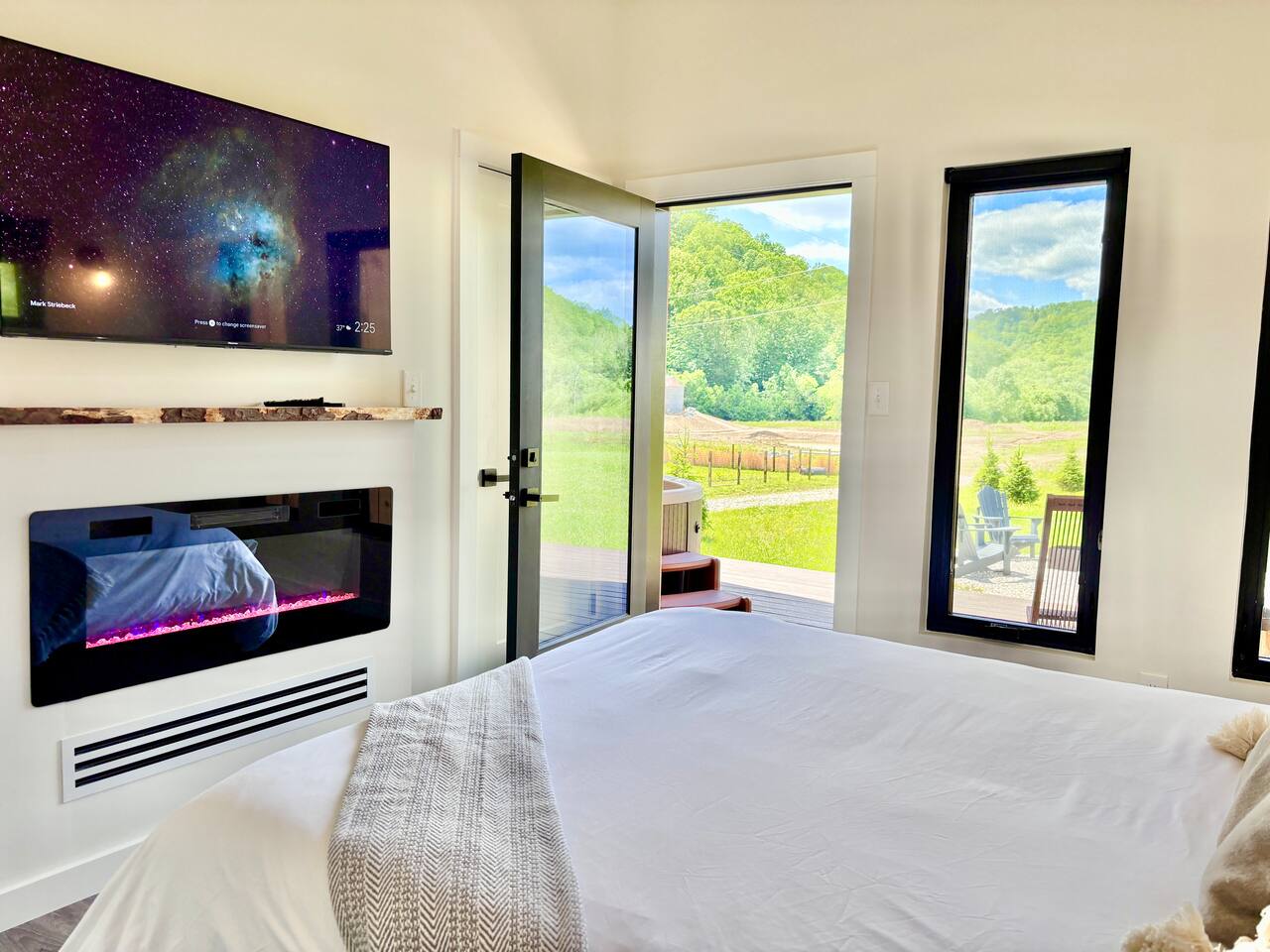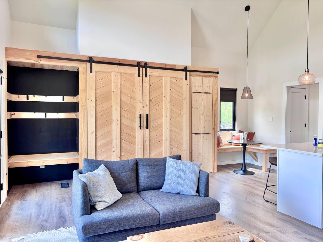 Wildflower Walk is a Nordic-inspired haven that offers ample space for both relaxation and recreation. The main living area boasts an open living room, kitchen, and a cozy breakfast nook. Discover concealed XL bunk beds behind grand barn-style doors for those who want to sleep in style! The kitchen is equipped with modern appliances and bar seating for four, perfect for casual dining or socializing. An electric fireplace adds a touch of warmth and ambiance to the living space, complemented by entertainment options on a smart TV. The bedroom boasts a plush queen-sized mattress accompanied by a private fireplace and a second smart TV for added comfort and convenience. Step through to the back entrance, leading to a private deck overlooking amazing views. Here, you can unwind in the hot tub or follow the walking path to the fire pit, where starlit evenings await amidst the expansive beauty of the Red River Valley. Outside, Wildflower Walk offers vast flat outdoor areas, ideal for gatherings and leisurely strolls. Discover tranquility in a dedicated hammock area near the Red River, where you can immerse yourself in the soothing sounds of nature. Whether seeking relaxation or adventure, Wildflower Walk provides the perfect retreat with 1100 feet of the Red River and access to a large sandy beach for relaxing, fishing and kayaking. Wildflower Walk is a part of Three Suns Cabins, a collection of 8 uniquely decorated Nordic modern cabins, and may be rented together as a group for larger parties or special occasions.