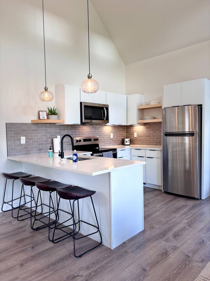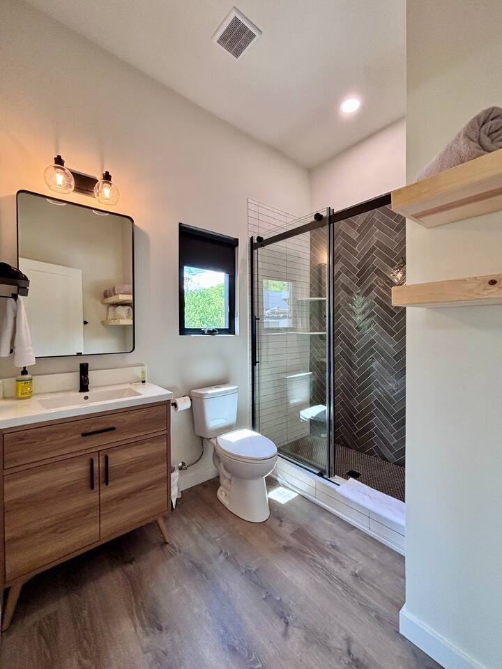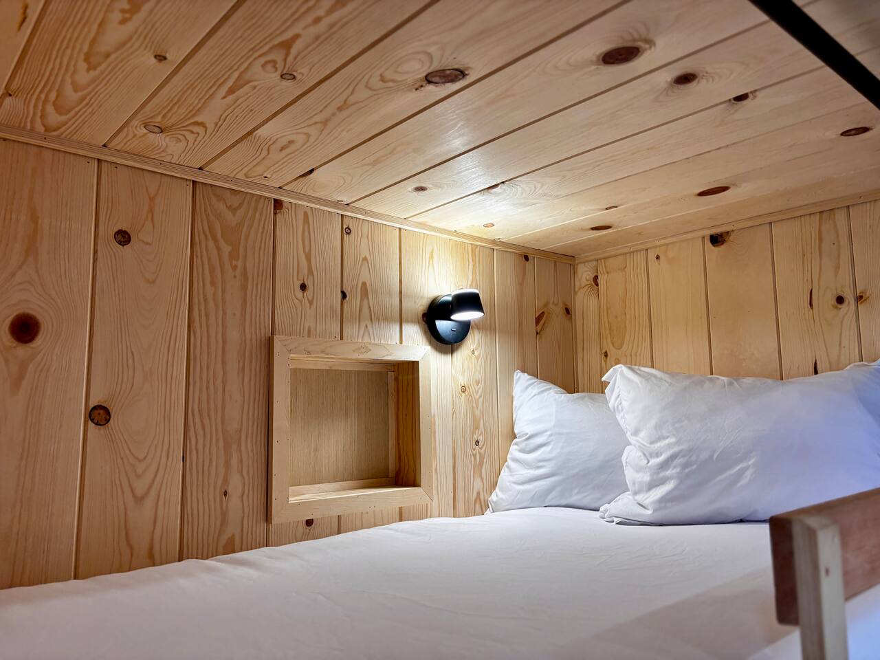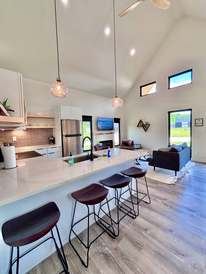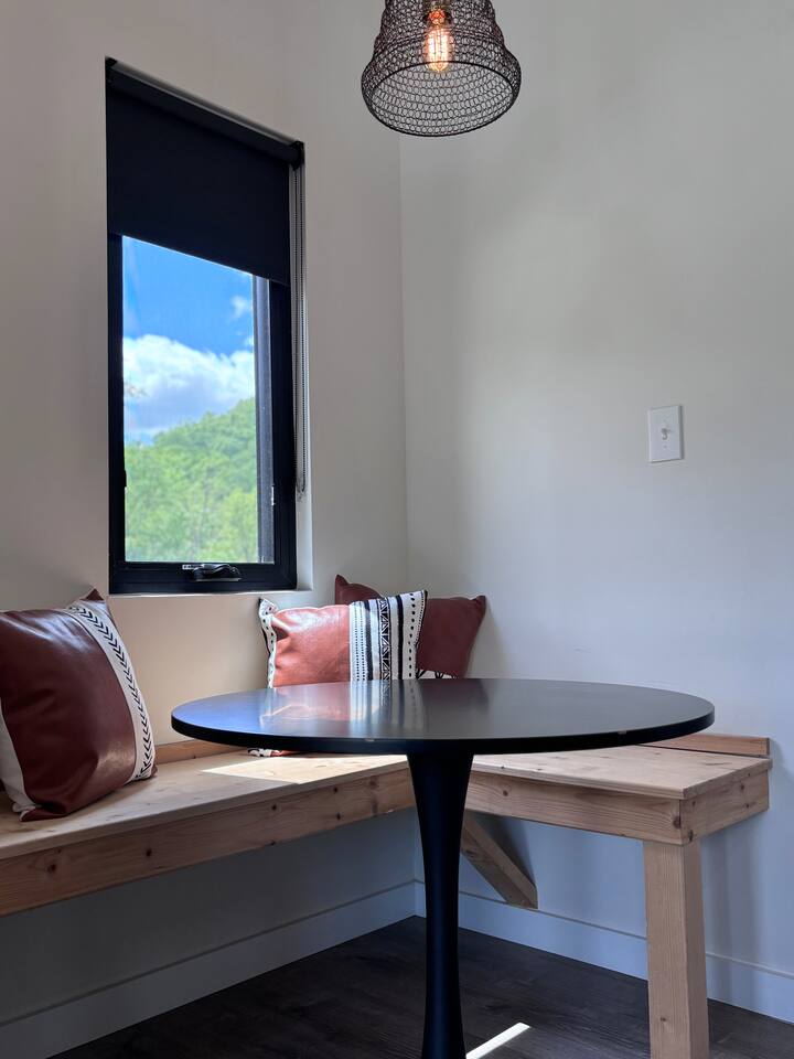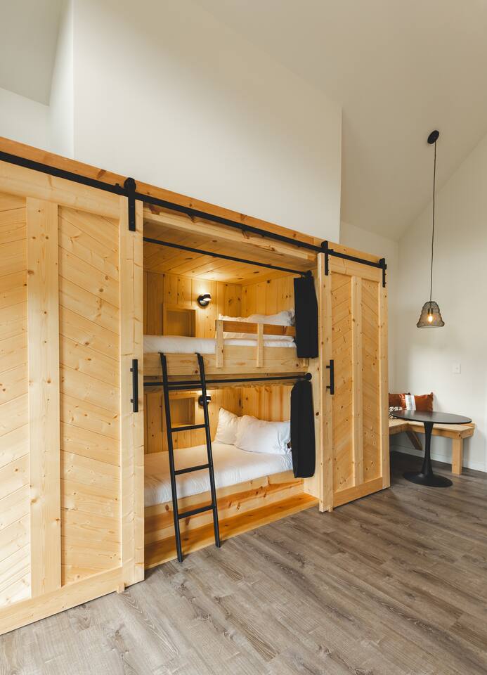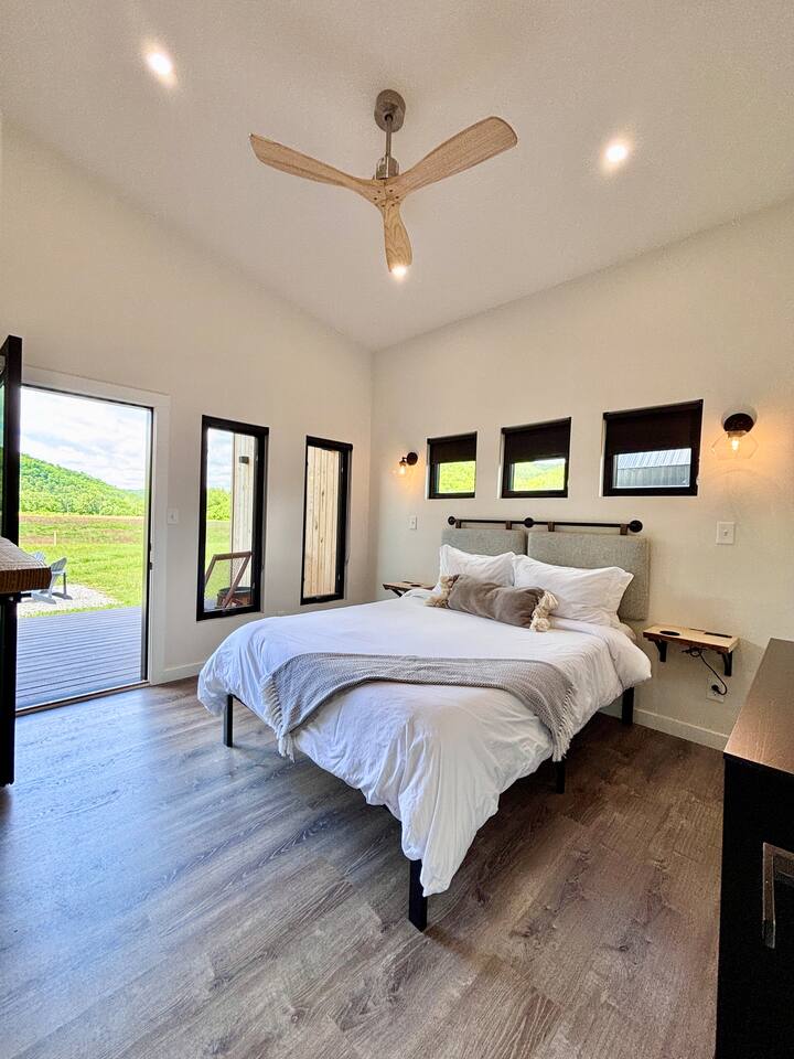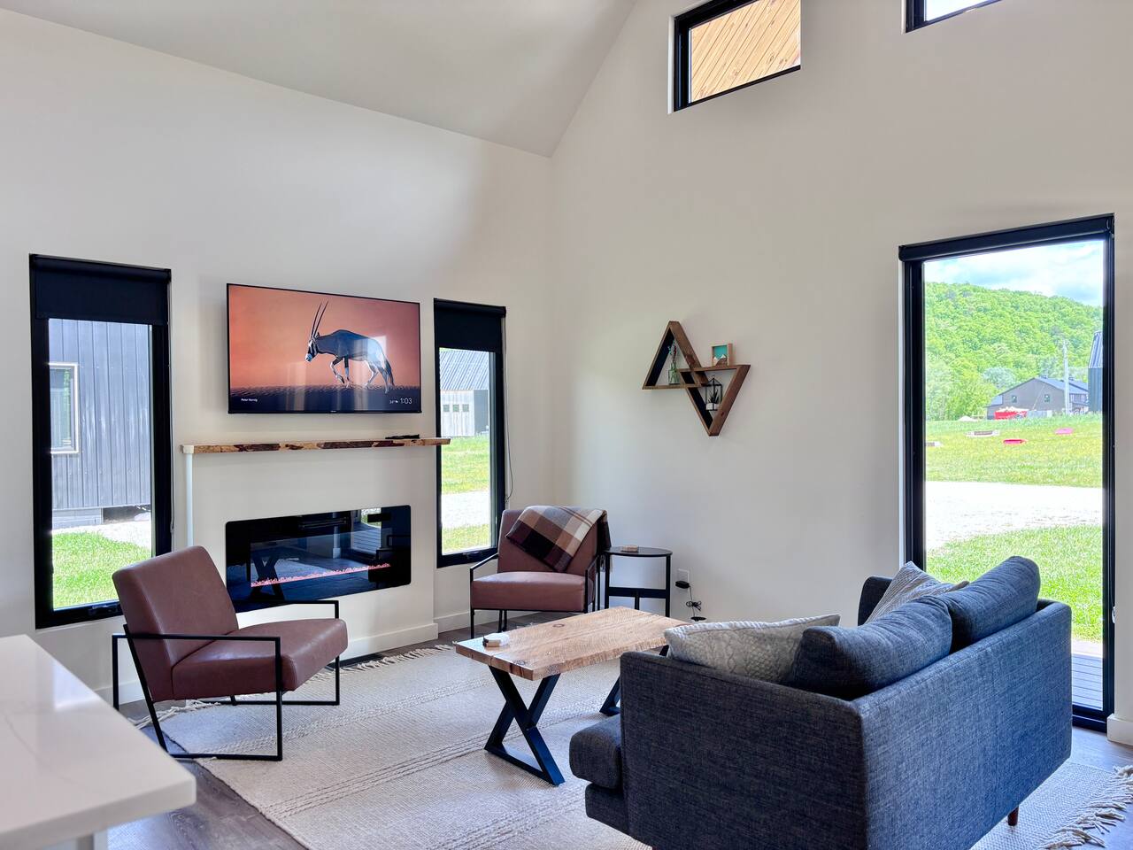 Wildflower Walk is a Nordic-inspired haven that offers ample space for both relaxation and recreation. The main living area boasts an open living room, kitchen, and a cozy breakfast nook. Discover concealed XL bunk beds behind grand barn-style doors for those who want to sleep in style! The kitchen is equipped with modern appliances and bar seating for four, perfect for casual dining or socializing. An electric fireplace adds a touch of warmth and ambiance to the living space, complemented by entertainment options on a smart TV. The bedroom boasts a plush queen-sized mattress accompanied by a private fireplace and a second smart TV for added comfort and convenience. Step through to the back entrance, leading to a private deck overlooking amazing views. Here, you can unwind in the hot tub or follow the walking path to the fire pit, where starlit evenings await amidst the expansive beauty of the Red River Valley. Outside, Wildflower Walk offers vast flat outdoor areas, ideal for gatherings and leisurely strolls. Discover tranquility in a dedicated hammock area near the Red River, where you can immerse yourself in the soothing sounds of nature. Whether seeking relaxation or adventure, Wildflower Walk provides the perfect retreat with 1100 feet of the Red River and access to a large sandy beach for relaxing, fishing and kayaking. Wildflower Walk is a part of Three Suns Cabins, a collection of 8 uniquely decorated Nordic modern cabins, and may be rented together as a group for larger parties or special occasions.